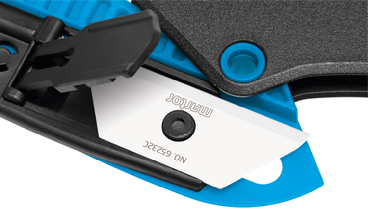 无需额外工具便可更换刀片,且完全无需拆卸。相反:按下刀片更换按钮并完全翻开蓝色压杆,即可更换刀片。