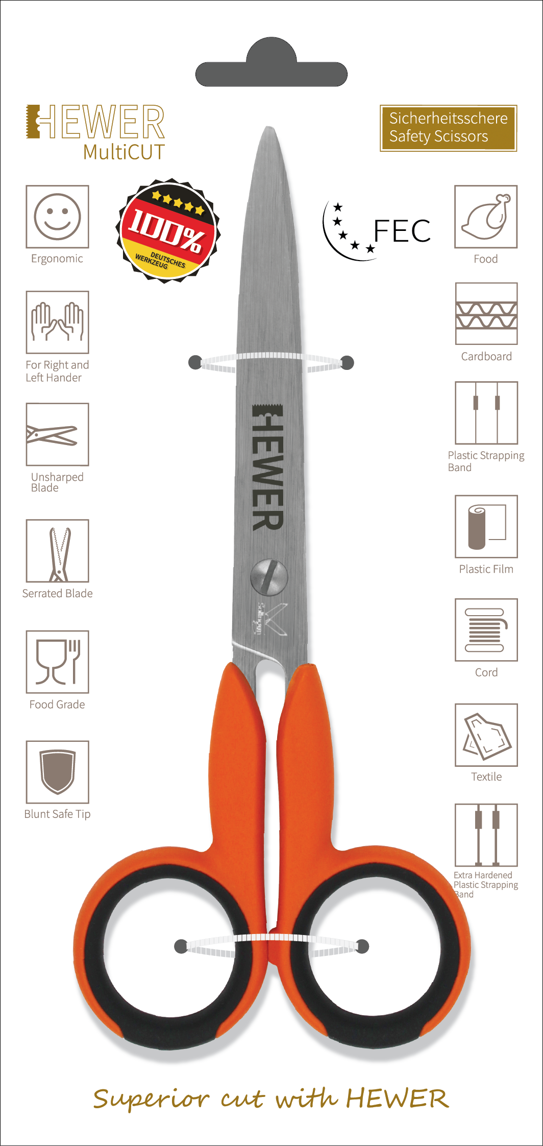 德国HEWER万用安全剪刀适合用于家庭、办公室、学校、室内装饰和手工艺制作作品,适合剪切布料、皮革、纸、衣服和柔软原料,产品获欧盟FEC食品级认证,既卫生又可靠。圆头设计避免在剪切过程中发生意外,带齿式平刀刃可以更有效地剪切食物及材料。产品可确保各种任务的防滑切割,省力。环保材质把手、时尚防滑,让您感到完全舒适。右手与左手皆具有绝佳的抓握力。