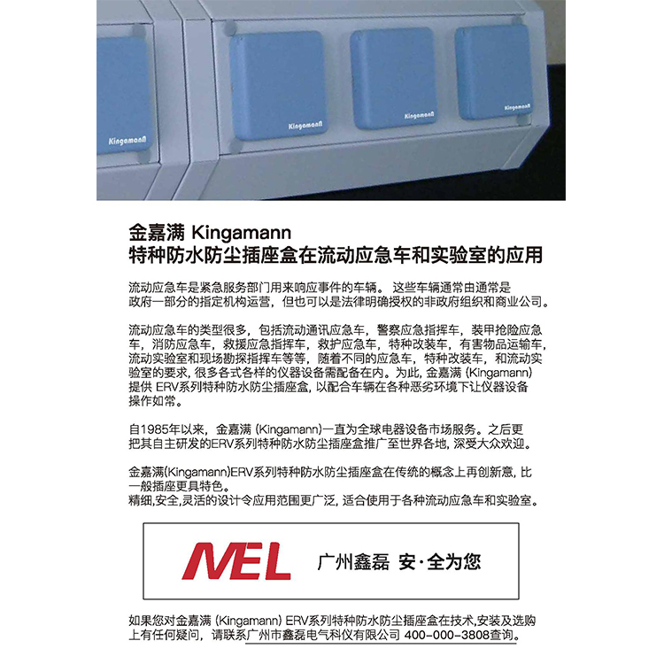 金嘉满(Kingamann)ERV系列特种防水防尘网络插座盒在传统的概念上再创新意, 比一般插座更具特色。 精细,安全,灵活的设计令应用范围更广泛, 适合使用于各种流动应急车和实验室。