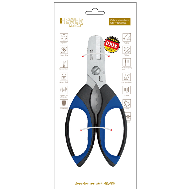 HEWER MultiCUT HK-3108包装捆扎带安全剪刀适用于切割各种材料的扎带,如聚丙烯,扁平尼龙和聚酯。刀片的涂层比钢硬三倍,持久耐用。锯齿刀片切割时可将材料固定到位。大圆形尖端为切割包装带提供了极其安全的工具。柔软大手柄有助于确保舒适和防滑工作,即使戴着手套工作也不会影响其灵活性。