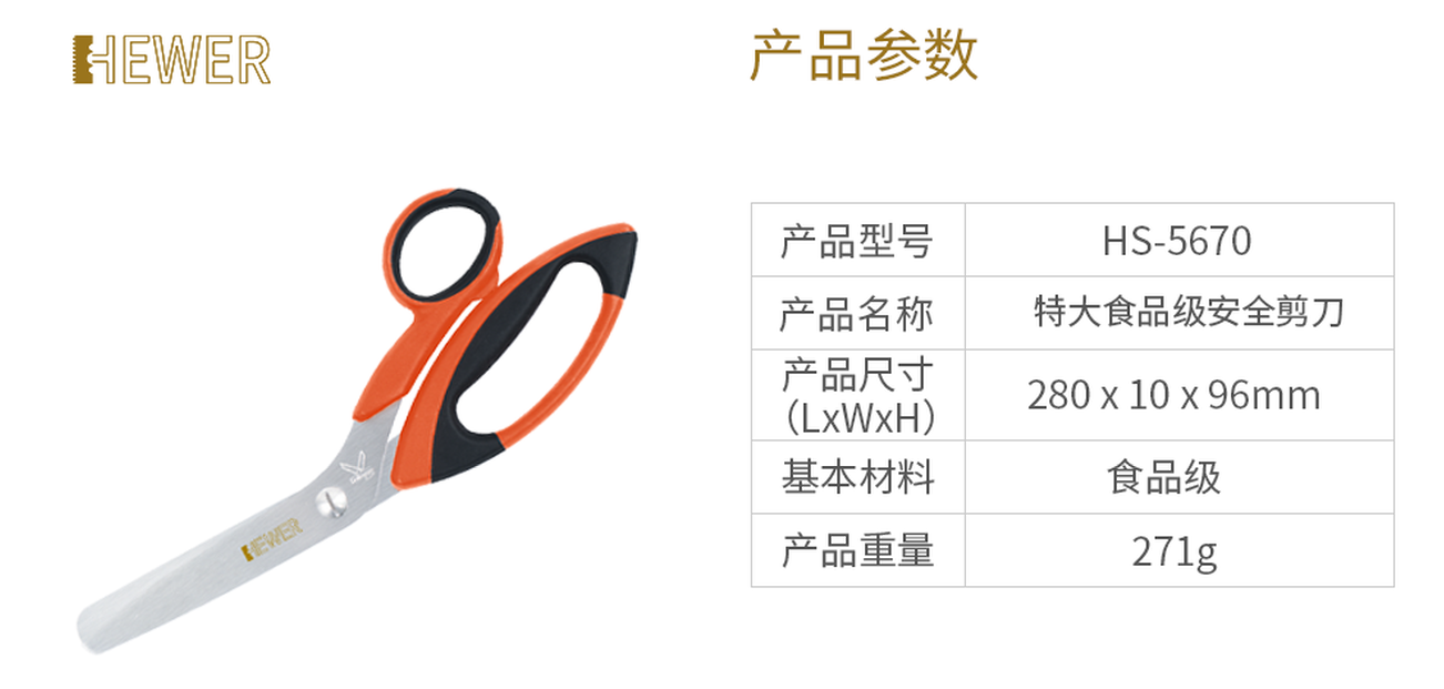 德国熙骅HEWER HS-5670 不锈钢圆头不伤手安全剪刀拥有更长的刀刃及更大的手柄,适合剪切更大的食物及各种材料。