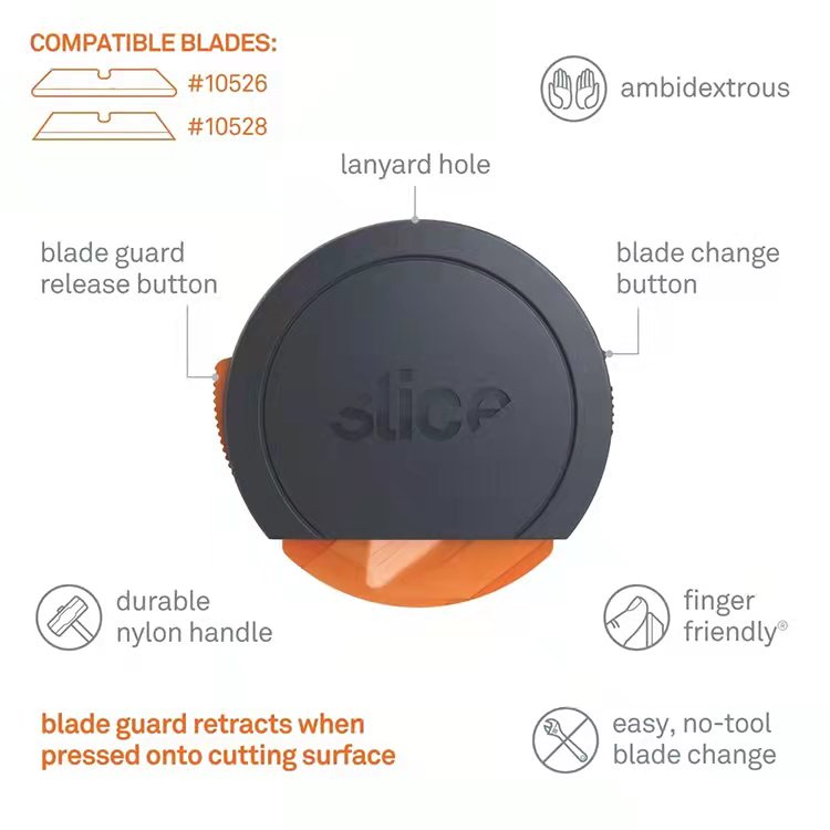 Slice Super-Safe™ 陶瓷安全刀具是一种独特的安全开箱器,其设计非常适合那些有灵活性问题的人或任何戴工作手套的人。 其大号圆形手柄可舒适地握在手掌中,实现笔直齐平的剪裁。 用食指按下橙色按钮以解锁刀片防护罩。