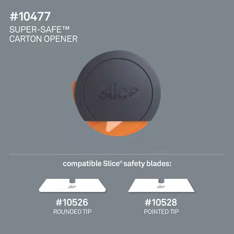 然后,将工具向下压,齐平,放在切割表面上并拉动以进行切割。 一旦 Super-Safe™ 陶瓷安全刀具不再靠在切割表面上,它的刀片防护罩就会重新展开,以确保用户在滑倒时的安全。 与所有 Slice 工具一样,Super-Safe™ 陶瓷安全刀具采用安全刀片,触摸安全、切割有效,并且使用寿命比同类钢刀片长 11 倍。 安装的圆头刀片 (10526) 也可以用可选的尖头刀片 (10528) 替换,用于需要穿刺以启动切割的材料。