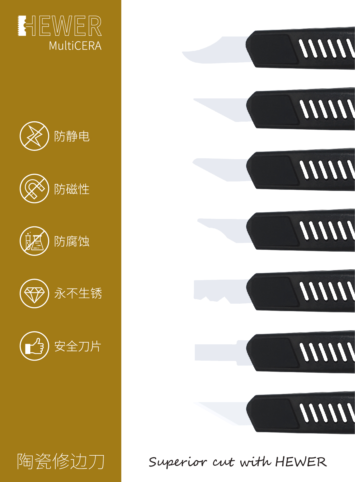 有别于一般陶瓷,用于制作 HEWER MultiCERA 陶瓷修边刀的高级精密陶瓷含100%二氧化锆,;一种熔点约 2700℃,沸点约 4300℃,稳定性极高的白色晶体,让修边作业更流畅,更省成本。